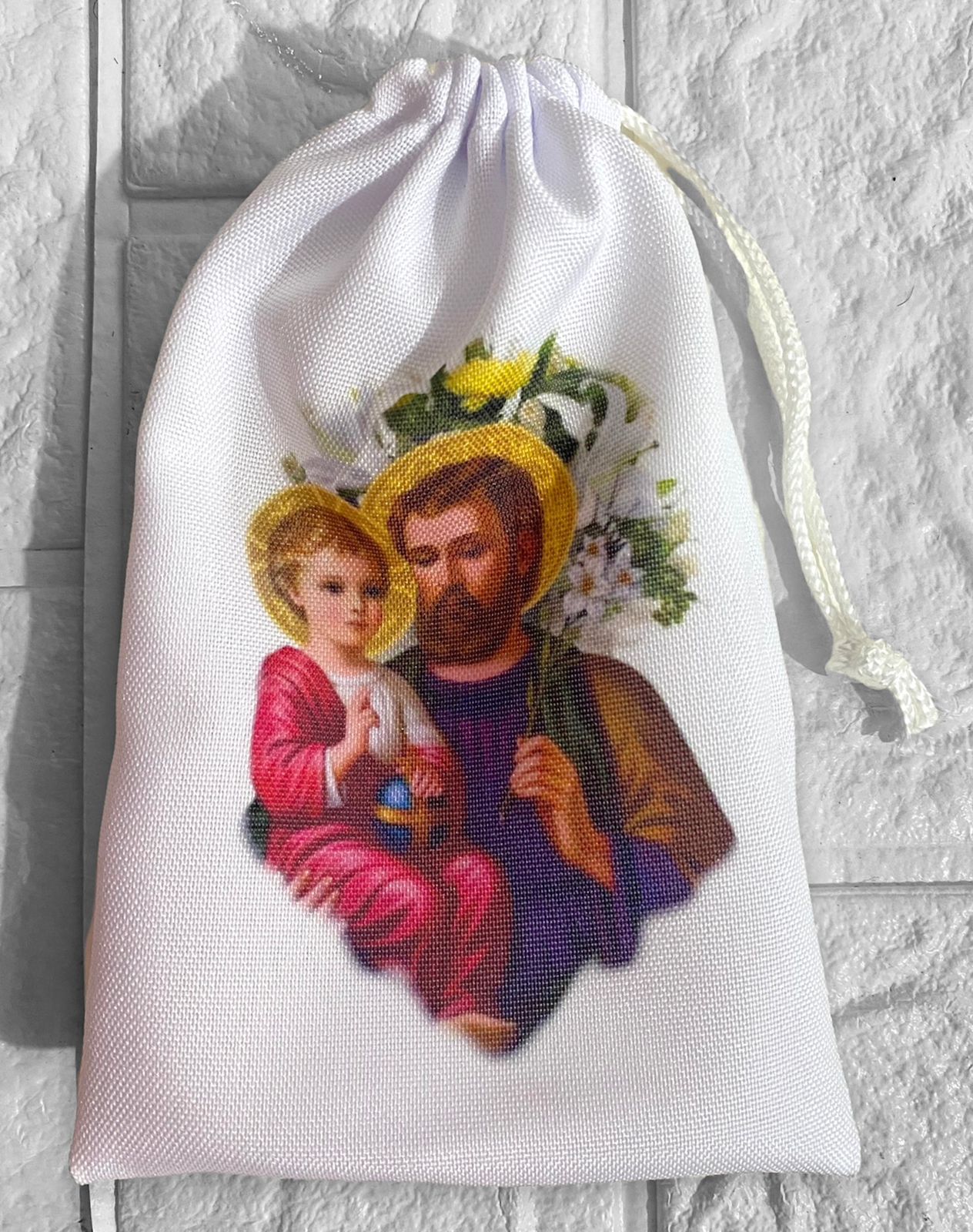 Impressão de 1 lado e feitos em tecido de oxford , com cordãozinho na cor branca para fechar
